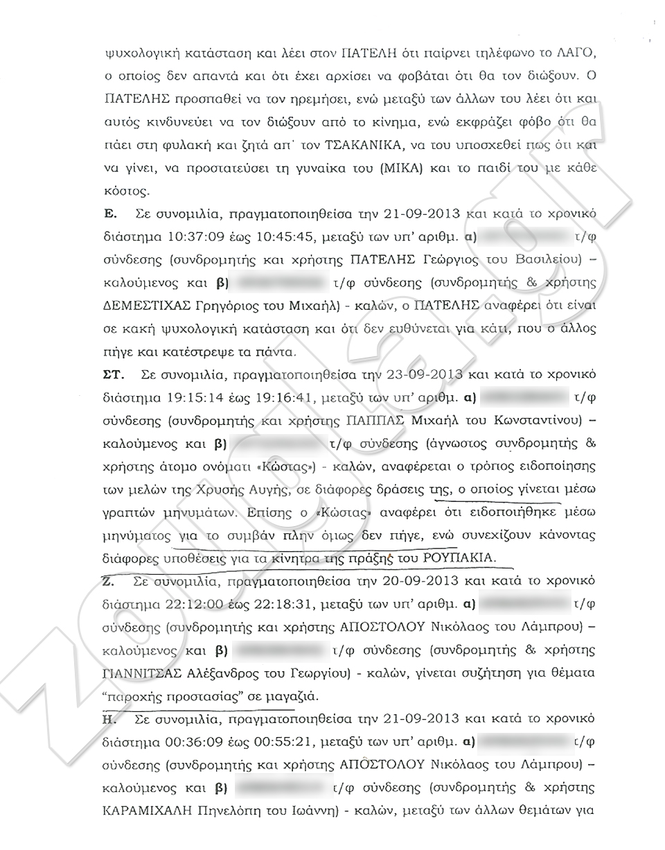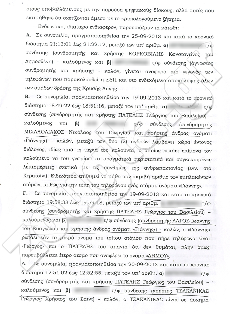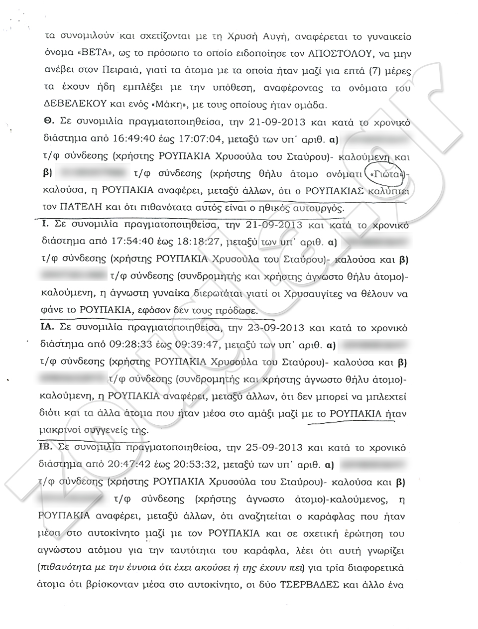 Ιδιαίτερα ενδιαφέρουσα είναι μια τηλεφωνική συνομιλία μεταξύ του Νίκου Μιχαλολιάκου και του αρχηγού της τοπικής οργάνωσης της Νίκαιας, Γιώργου Πατέλη στις 19 Σεπτεμβρίου, από τις 18:49 έως και τις 18:51.