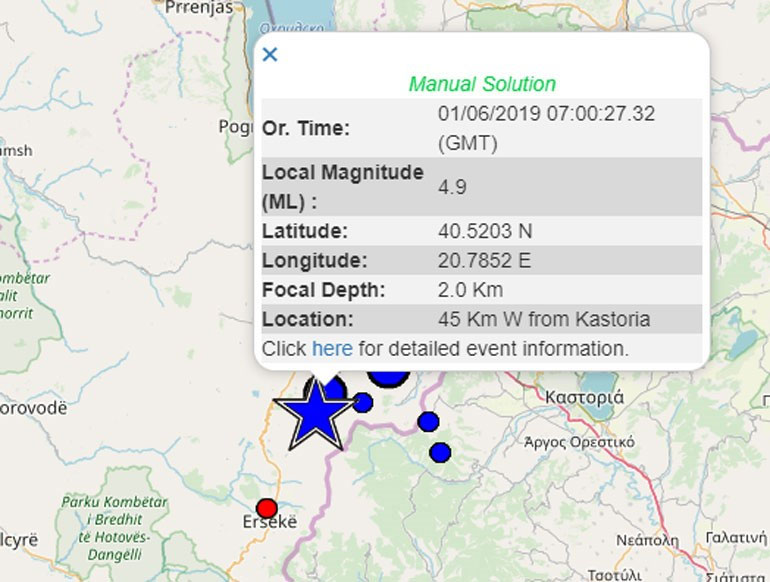 Το επίκεντρο του πρώτου σεισμού (που σημειώθηκε στις 7.26) εντοπίζεται 47 χλμ. δυτικά της Καστοριάς κοντά στην αλβανική πόλη Ερσέκα και το εστιακό βάθος εκτιμάται στα 3,5 χλμ.