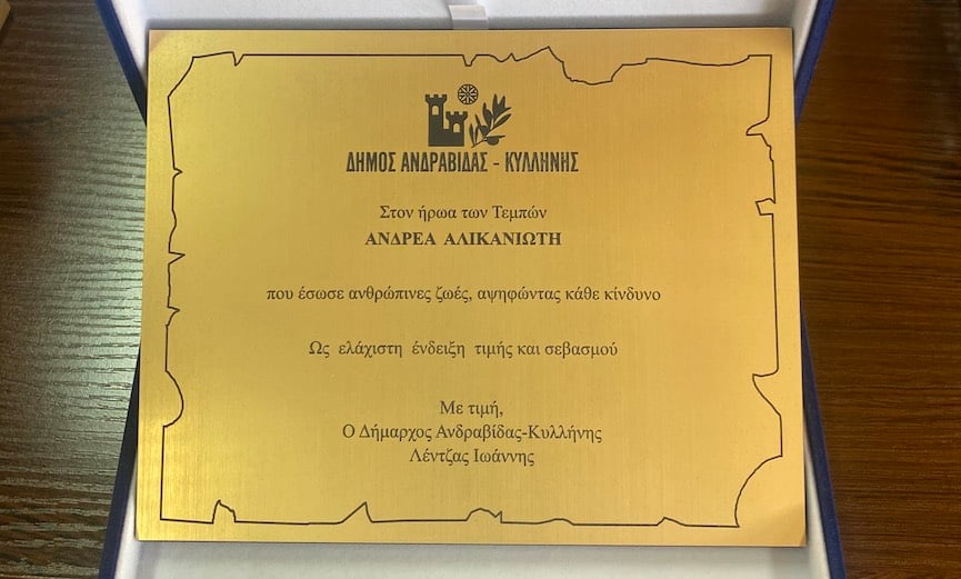 Τον ήρωα των Τεμπών Ανδρέα Αλικανιώτη τίμησε ο Δήμος Ανδραβίδας-Κυλλήνης σε μία λιτή τελετή στο Δημαρχείο των Λεχαινών. Ο Δήμαρχος Ανδραβίδας-Κυλλήνης Γιάννης Λέντζας του απένειμε τιμητική πλακέτα, ως ένδειξη ελάχιστου σεβασμού και τιμής.