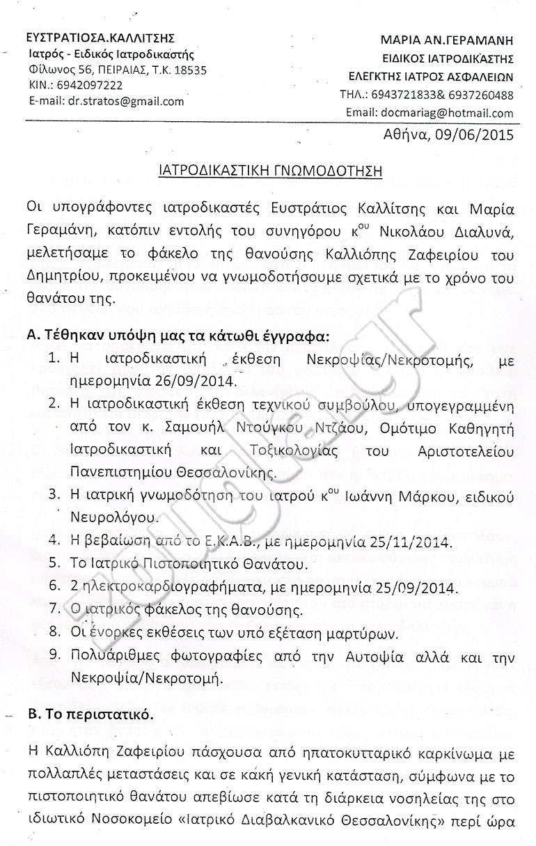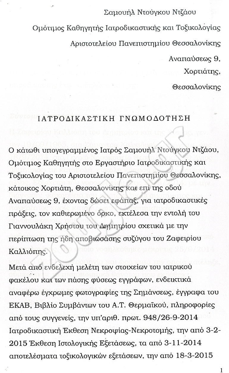 Στο ίδιο μήκος κύματος όμως κυμαίνεται και η ιατροδικαστική γνωμοδότηση που υπογράφεται από τους ιατροδικαστές Στράτο Καλλίτση και Μαρία Γεραμάνη.