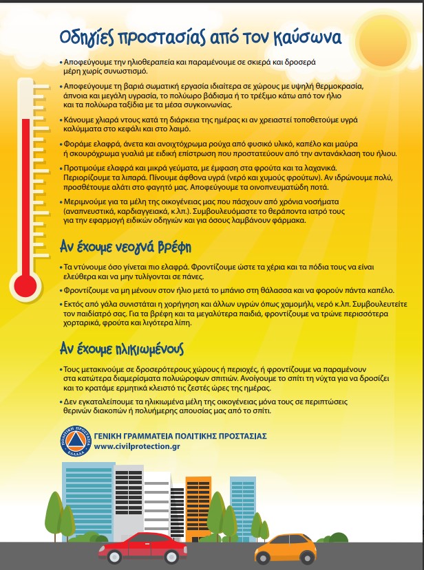 «Η Γενική Γραμματεία Πολιτικής Προστασίας (www.civilprotection.gr) του Υπουργείου Προστασίας του Πολίτη, έχει ενημερώσει τις αρμόδιες υπηρεσιακά εμπλεκόμενες κρατικές υπηρεσίες, καθώς και τις περιφέρειες και τους δήμους της χώρας, ώστε να βρίσκονται σε αυξημένη ετοιμότητα πολιτικής προστασίας, προκειμένου να αντιμετωπίσουν άμεσα τις επιπτώσεις από την επικράτηση των υψηλών θερμοκρασιών.