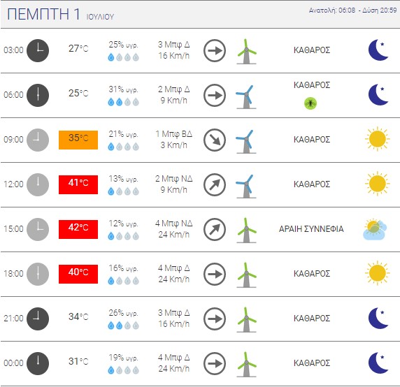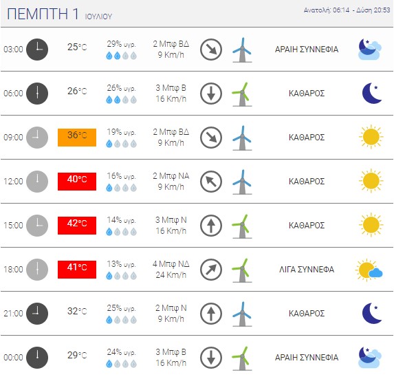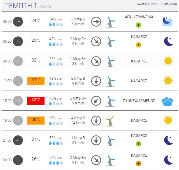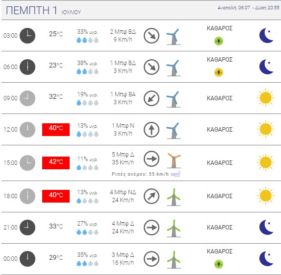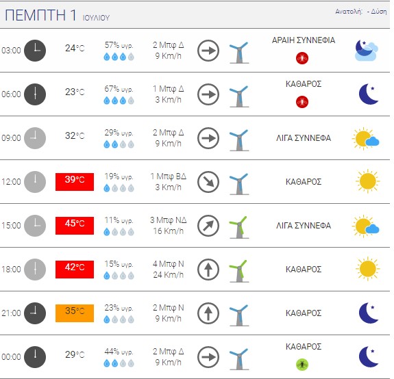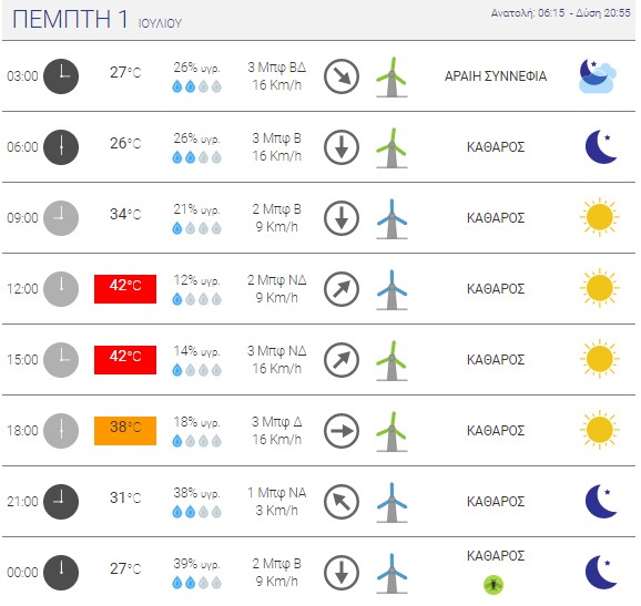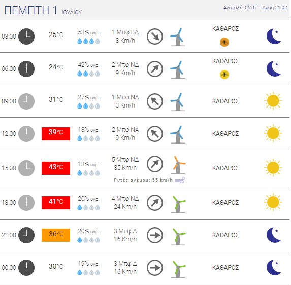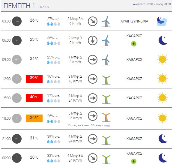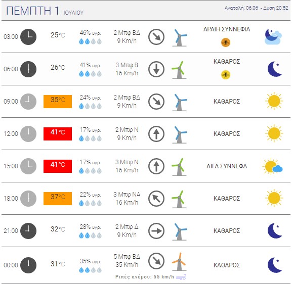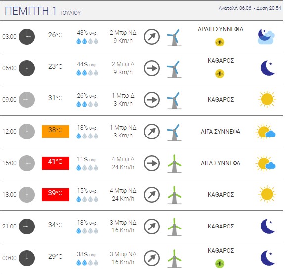 Την Πέμπτη (01-07-2021), οι μέγιστες τιμές θα σημειωθούν στη Θεσσαλία, την Ανατολική Στερεά και την Ανατολική και Νότια Πελοπόννησο και προβλέπεται να φτάσουν τους 42 και κατά τόπους τους 43 βαθμούς Κελσίου. Στα υπόλοιπα ηπειρωτικά θα κυμανθούν μεταξύ 39 και 41 βαθμών, εκτός της ανατολικής Μακεδονίας και της Θράκης όπου προβλέπεται να είναι 2 με 3 βαθμούς χαμηλότερη. Στα νησιά του Ιονίου και στην Κρήτη θα φτάσουν κατά τόπους τους 38 με 39 βαθμούς Κελσίου, ενώ στις υπόλοιπες νησιωτικές και παραθαλάσσιες περιοχές 2 με 3 βαθμούς χαμηλότερη.