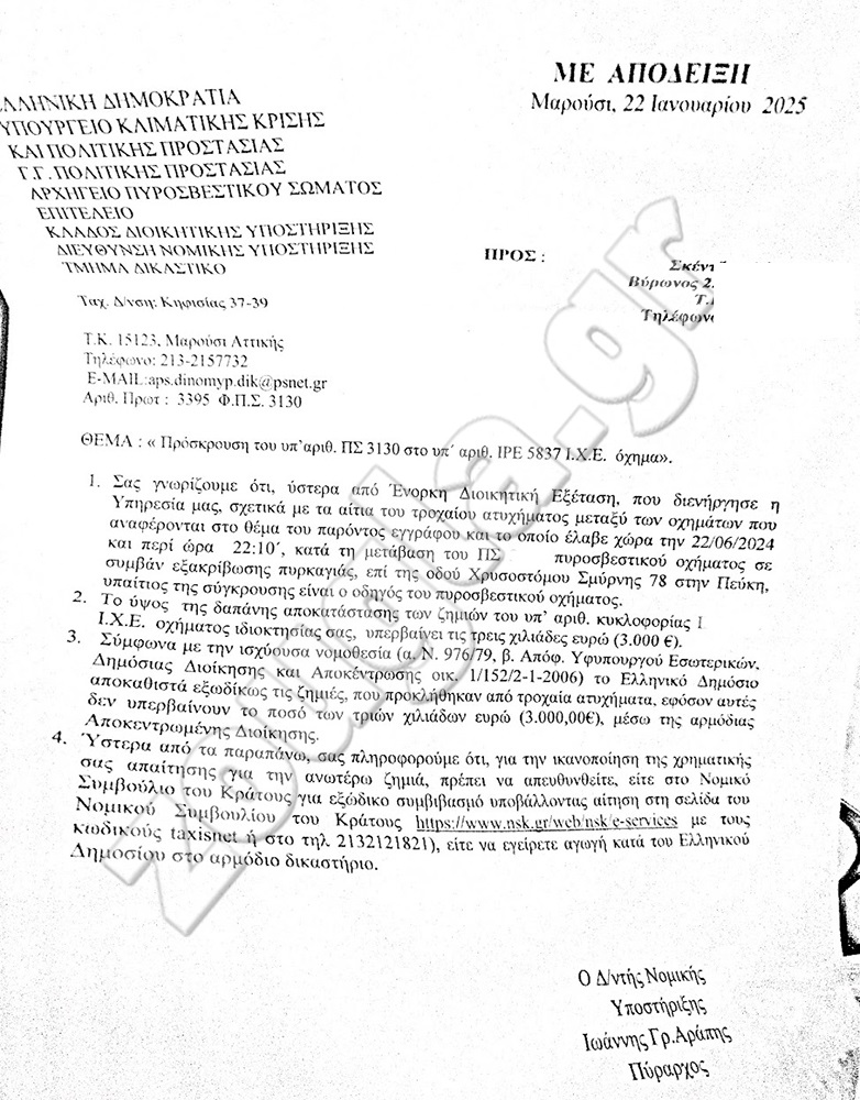 Μετά από λίγες ημέρες όμως της ήρθε ένα έγγραφο, ενδεικτικό του πόσο πραγματικά «ενδιαφέρονται» οι ιθύνοντες για τέτοιες περιπτώσεις. Σε αυτό την ενημερώνουν ότι πράγματι με βάση την σχετική ΕΔΕ, υπεύθυνος του ατυχήματος είναι ο οδηγός του πυροσβεστικού οχήματος και η ίδια δικαιούται να λάβει αποζημίωση για την ζημιά που υπέστη το αυτοκίνητό της. Μπορεί να εισπράξει… 3.000 ευρώ, που με βάση την σχετική νομοθεσία αποτελούν το ταβάνι των αποζημιώσεων που μπορεί να δώσει το δημόσιο εξωδικαστικά. Για τα υπόλοιπα 6.500 ευρώ θα πρέπει… να προσφύγει με σχετικό αίτημα στο Νομικό Συμβούλιο του Κράτους και στα αρμόδια δικαστήρια.