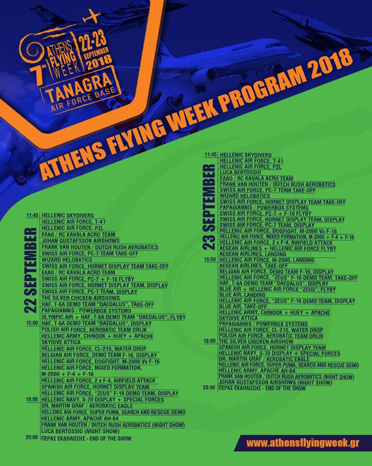 Η μεγαλύτερη αεροπορική γιορτή της Ελλάδας, η Athens Flying Week (AFW) Tanagra International Air Show 2018, έρχεται και φέτος στις 22 και 23 Σεπτέμβρη έτοιμη να απογειώσει για 7η συνεχόμενη χρονιά τους θαυμαστές της και να τοποθετήσει για μία εβδομάδα την Αθήνα στο κέντρο του αεροπορικού κόσμου.