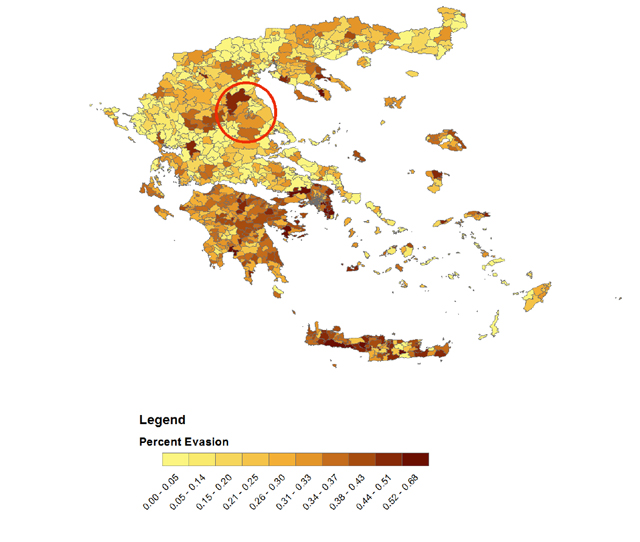 Ο παραπάνω χάρτης αναπαριστά το ποσοστό της φοροδιαφυγής σε κάθε περιοχή – τα σκούρα χρώματα δείχνουν υψηλότερα ποσοστά και τα ανοιχτά τα χαμηλότερα.