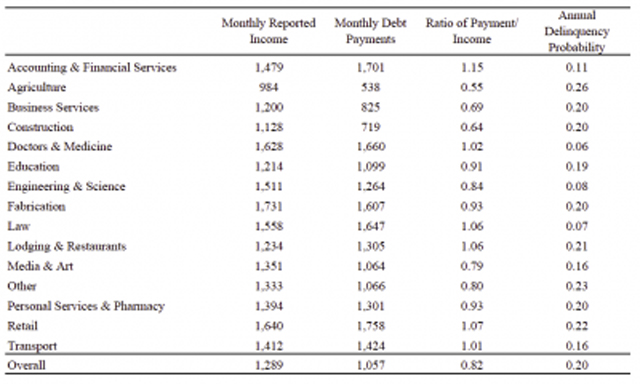Οι μελετητές έλεγξαν τις χορηγήσεις δανείων των τραπεζών προς τους ελεύθερους επαγγελματίες και διαπίστωσαν πως, με βάση το εισόδημα που δήλωναν στην εφορία, υπήρχαν δάνεια των οποίων η δόση έφθανε έως και το 82% του εισοδήματος του δανειολήπτη. Και αυτό, τη στιγμή που οι τράπεζες, κατά μέσο όρο, χορηγούν δάνεια, έτσι ώστε η δόση να αντιστοιχεί μόλις στο 30% του εισοδήματος.