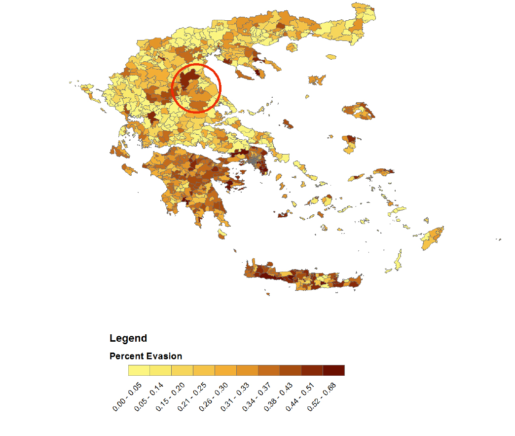 Ο παραπάνω χάρτης αναπαριστά το ποσοστό της φοροδιαφυγής σε κάθε περιοχή – τα σκούρα χρώματα δείχνουν υψηλότερα ποσοστά και τα ανοιχτά τα χαμηλότερα.