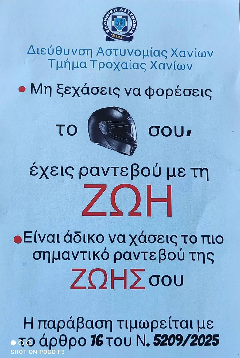 «Με αφορμή την πανελλαδική εκστρατεία «Μηδενική ανοχή στη μη χρήση κράνους», πραγματοποιήθηκε χθες (11.07.2025) στα Χανιά, ενημερωτική δράση με αντικείμενο την οδική ασφάλεια και επίκεντρο αυτής τη χρήση προστατευτικού κράνους, από το σύνολο των αναβατών μοτοποδηλάτων, μοτοσικλετών, τρίτροχων και ενοικιαζόμενων οχημάτων χωρίς κουβούκλιο, καθώς και επαγγελματιών διανομέων.