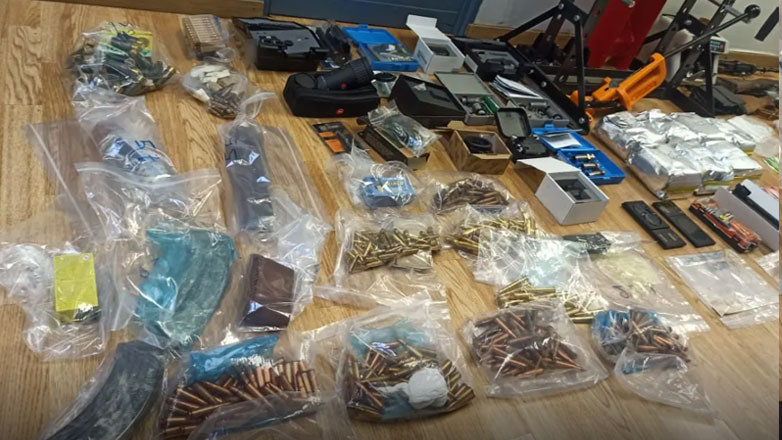 Συγκεκριμένα, εκτός από ποσότητες ναρκωτικών και εργαλεία για τη νόθευση και επανασυσκευασία ηρωίνης, βρέθηκαν 3 πιστόλια, 2 περίστροφα, 2 πολεμικά τυφέκια, 1 κυνηγετικό όπλο, 1 σιγαστήρας, αναδιπλούμενο μαχαίρι, ξιφολόγχη, 3.476 φυσίγγια, 80 αβολίδωτα φυσίγγια, 12 γεμιστήρες, 21 πυροκροτητές, 500 γραμμ. στερεής εκρηκτικής ύλης, 4 βραδύκαυστα φυτίλια, 2 ζεύγη χειροπέδες, τα χρηματικά ποσά των 7.790 ευρώ, 440 φράγκα Ελβετίας , 20 δολάρια Η.Π.Α. και 16 χρυσές λίρες, 5 κινητά τηλέφωνα, μηχάνημα επαναγέμισης φυσιγγίων, ηλεκτρικός δοσομετρητής πυρίτιδας, 8 διόπτρες και δίποδο στήριξης όπλου.