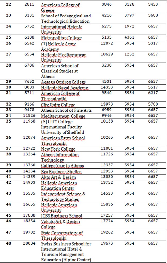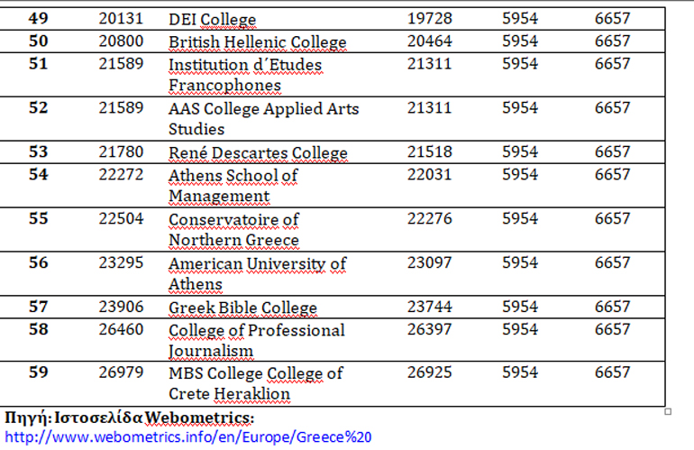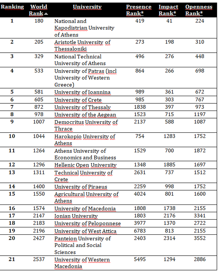 Με βάση τα αποτελέσματά της μετά το Εθνικό και Καποδιστριακό Πανεπιστήμιο Αθηνών ακολουθούν το Αριστοτέλειο Πανεπιστήμιο Θεσσαλονίκης στη θέση 205, το Εθνικό Μετσόβιο Πολυτεχνείο στη θέση 329, ενώ την πρώτη πεντάδα κλείνουν το Πανεπιστήμιο Πατρών στη θέση 533 και το Πανεπιστήμιο Ιωαννίνων στη θέση 581. Στη συγκεκριμένη κατάταξη που δημοσιεύτηκε περιλαμβάνονται περίπου 12.000 πανεπιστήμια παγκοσμίως από τα 30.000 για τα οποία συγκεντρώθηκαν στοιχεία. Ανάμεσα σε αυτά βρίσκονται και ελληνικά πανεπιστήμια, και ιδιωτικοί φορείς (βλέπε πίνακα 1).