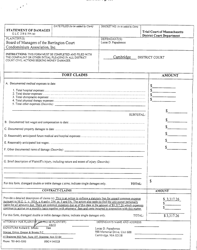 -Nα αναγνωρίσει ότι ο εναγόμενος (σ.σ. ο Λουκάς Παπαδήμος) χρωστά το ποσό των 3.317,26 δολαρίων που αντιστοιχούν σε κοινές δαπάνες (σ.σ. κοινόχρηστα), τόκους, ληξιπρόθεσμες αποζημιώσεις παροχής υπηρεσιών, έξοδα δικηγόρου κλπ.