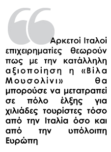 Οικονομικοί αναλυτές εκτιμούν πως μέχρι τις 5 Σεπτεμβρίου θα υπάρξουν εξελίξεις με τον διαγωνισμό. Η «Villa de Vechi», στην οποία ο Μπενίτο Μουσολίνι δεν πρόλαβε να μείνει καθώς βρέθηκε στην πλευρά των ηττημένων του Β΄ Παγκοσμίου Πολέμου, εντάσσεται σε μια ομάδα 14 ακινήτων, που θα παραχωρηθούν προς εκμετάλλευση για 50 χρόνια. Σύμφωνα με το περιεχόμενο του διαγωνισμού, ο νικητής της διαδικασίας θα κληθεί να δημιουργήσει μικρά ξενοδοχεία υψηλής αισθητικής (γνωστά και ως «Boutique Hotels»).