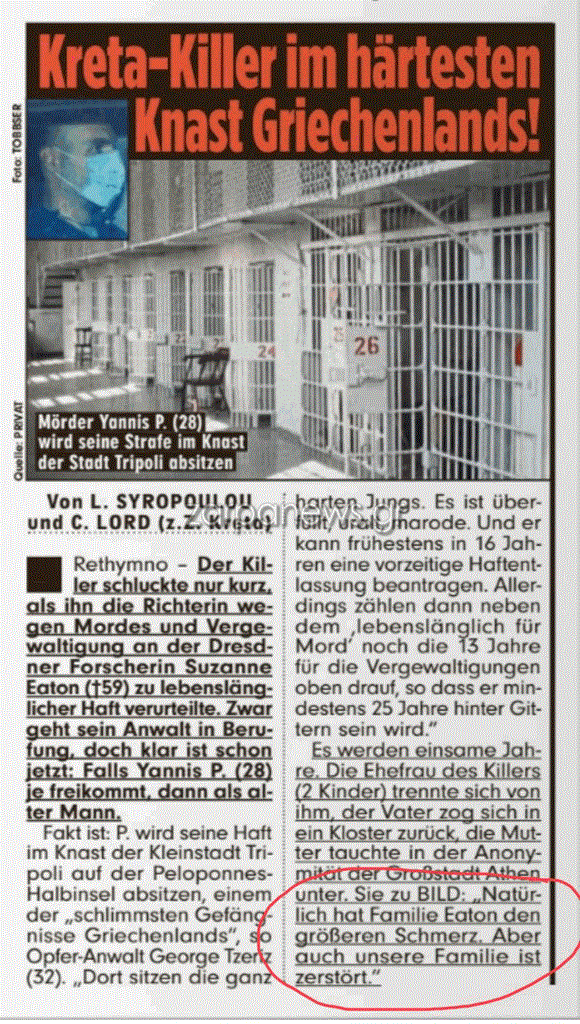 Στο μεταξύ τη δική της συγγνώμη είπε και η μητέρα του δολοφόνου της Suzanne Eaton. Η Μαρία Παρασκάκη μίλησε για το βάρος που σηκώνει η οικογένειά της και η ίδια προσωπικά στην Γερμανική εφημερίδα Bild η οποία κάλυψε τη δίκη για τη δολοφονία της Suzanne Eaton στο Ρέθυμνο με δύο δημοσιογράφους.
