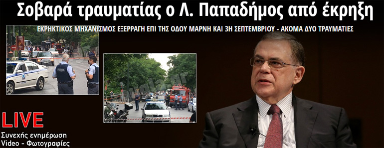 «Στις 19:10 διακομίσθηκε με ασθενοφόρο του ΕΚΑΒ, ο πρώην Πρωθυπουργός κος Λουκάς Παπαδήμος, στο Τμήμα Επειγόντων Περιστατικών του ΓΝΑ «Ο Ευαγγελισμός». Μετά την παροχή των πρώτων Βοηθειών, για αρκετά επιφανειακά τραύματα, στον θώρακα, την κοιλία και τους μηρούς, υπεβλήθη σε πλήρη κλινικό και εργαστηριακό έλεγχο. Αποφασίστηκε ο χειρουργικός καθαρισμός τραύματος της πρόσθιας επιφανείας του δεξιού μηρού, στον οποίο αυτή τη στιγμή ο ασθενής υποβάλλεται. Κρίθηκε ότι η κατάστασή του είναι σταθερή και δεν εμπνέει ανησυχία. Οι συνοδοί του, έφεραν ελαφρά επιφανειακά τραύματα για τα οποία δέχτηκαν τις πρώτες βοήθειες και παραμένουν σε νοσηλεία για προληπτικούς λόγους.