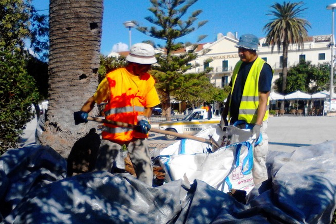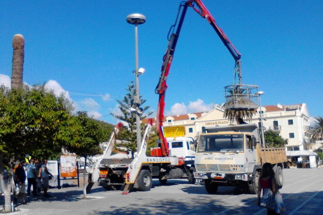 Το κόκκινο σκαθάρι των Φοινικοειδών «έφαγε» τους φοίνικες στην πλατεία Αργοστολίου. Το πρωί της Παρασκευής, συνεργεία του δήμου Κεφαλονιάς, έκοψαν δύο φοίνικες που είχαν πληγεί από το συγκεκριμένο έντομο.