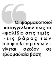 Οι φαρμακοποιοί καταγγέλλουν πως το «ψαλίδι» στις τιμές -εις βάρος των ασφαλισμένων- γίνεται σχεδόν σε εβδομαδιαία βάση. Ήδη, ο πρόεδρος της Ομοσπονδίας Νεφροπαθών Γιώργος Καστρινάκης κατήγγειλε την άνευ προηγουμένου αύξηση του κόστους αγοράς των φαρμάκων, δίνοντας ιδιαίτερη έμφαση στην κάτασταση που διαμορφώνεται με τα σιδηρούχα σκευάσματα, τα οποία χορηγούνται ενδοφλέβια στους νεφροπαθείς και σε αρκετές περιπτώσεις η τιμή τους είναι χαμηλότερη ακόμη και από το φθηνότερο γενόσημο σκεύασμα της αγοράς.
