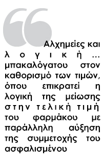 Η νέα… πατέντα για τη φαινομενική μείωση της τελικής τιμής σε σημαντικό αριθμό φαρμακευτικών σκευασμάτων είναι η αύξηση της συμμετοχής από τη μεριά του ασφαλισμένου, με παράλληλη μείωση της τιμής του φαρμάκου. Σε μια λογική που απορρέει από «το μη χείρον βέλτιστον», το Υπουργείο Υγείας αυξάνει το ύψος της δαπάνης που καλείται κάθε φορά ο ασφαλισμένος να καταβάλει για πλήθος φαρμάκων στο πλαίσιο της συμμετοχής του, μειώνοντας παράλληλα το αντίστοιχο ποσό του ασφαλιστικού φορέα.