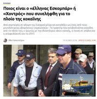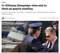 Σημειώνεται πως από το πρωί της Δευτέρας βρίσκεται σε εξέλιξη μεγάλη επιχείρηση του ελληνικού FBI, μετά από συνεννόηση με διεθνείς υπηρεσίες δίωξης ναρκωτικών, που εντόπισαν πλοίο, το οποίο ανήκει στον επονομαζόμενο «έλληνα Εσκομπάρ», Αλέξανδρο Αγγελόπουλο, να πλέει ανοιχτά της Γαλλίας, γεμάτο με φορτίο κοκαΐνης.