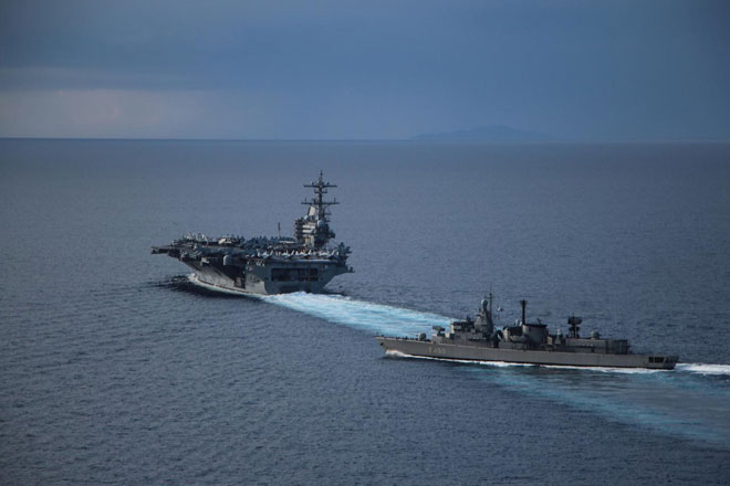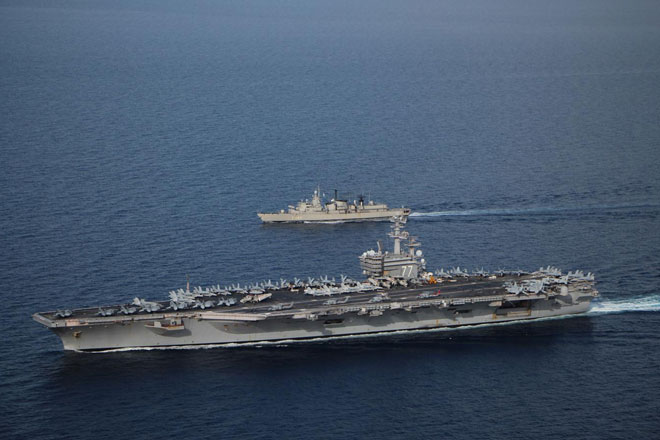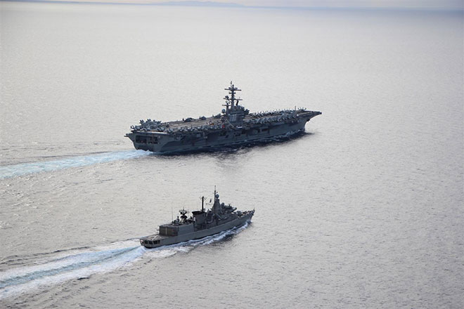 Η φρεγάτα που αποτελεί τη μεγαλύτερη πλωτή μάχιμη μονάδα του Ελληνικού Πολεμικού Ναυτικού έμοιαζε δίπλα στο αμερικανικό αεροπλανοφόρο «George H.W. Bush» σαν… συναρμολογούμενο παιχνιδάκι.