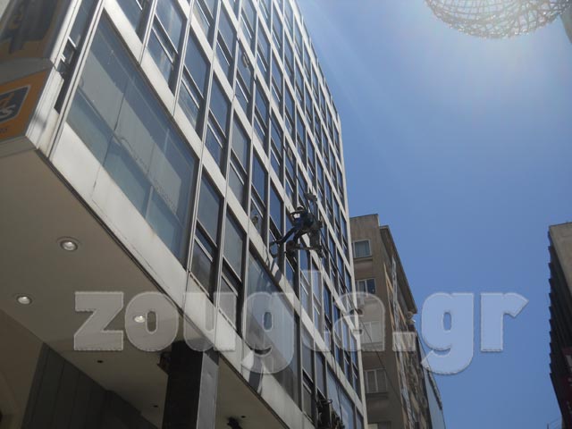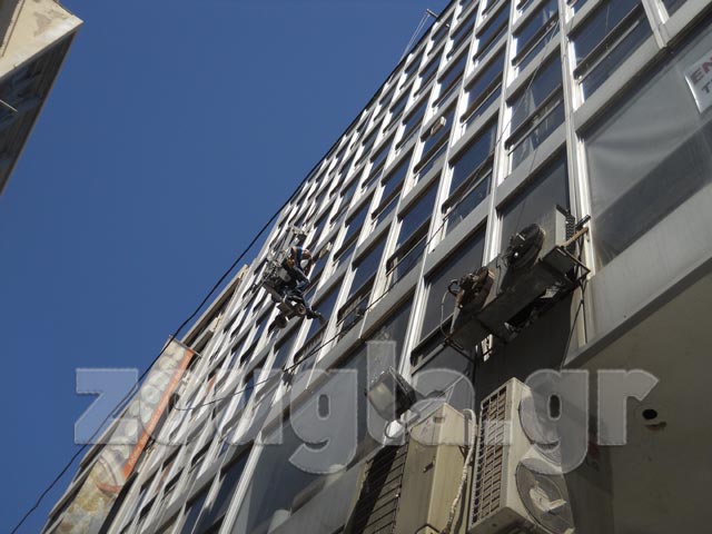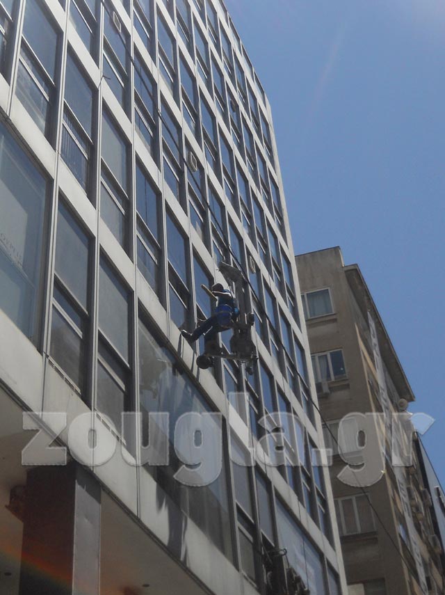 Κρεμασμένος από ένα συρματόσχοινο σε μια ειδική τροχαλία, σε ύψος πάνω από 20 μέτρα, καθαρίζει τα τζάμια από τα παράθυρα σε μια πολυκατοικία στο κέντρο της Αθήνας στην οδό Ερμού.