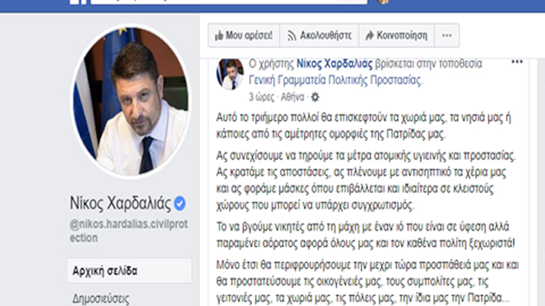 Μόνο έτσι θα περιφρουρήσουμε την μεχρι τώρα προσπάθειά μας και και θα προστατεύσουμε τις οικογένειές μας, τους συμπολίτες μας, τις γειτονιές μας, τα χωριά μας, τις πόλεις μας, την ίδια μας την Πατρίδα…», αναφέρει ο κ. Χαρδαλιάς σε ανάρτησή του στα social media.