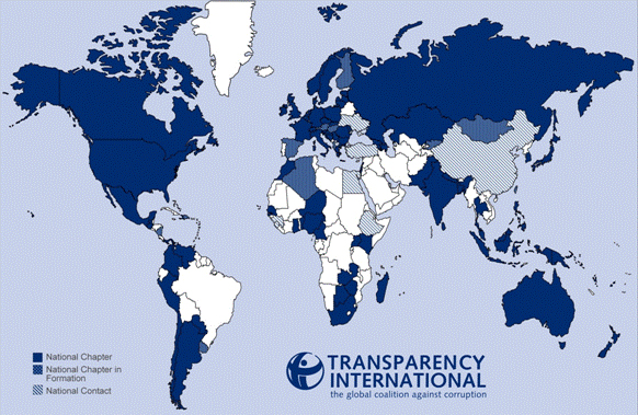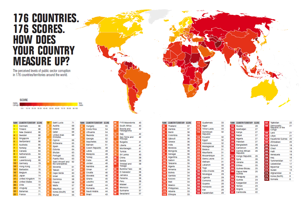 Η «Διεθνής Διαφάνεια» («Transparency International») καταρτίζει πίνακα με 176 χώρες ανάλογα με το επίπεδο διαφθοράς τους, σε μία κλίμακα που αρχίζει από το 0 για την πολύ μεγάλη διαφθορά και φτάνει έως το 100 για την ελάχιστη.