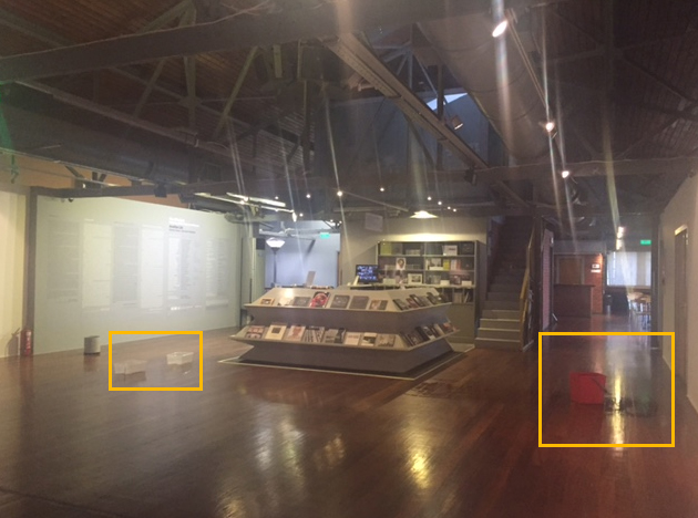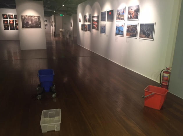 Κουβάδες και σφουγγαρίστρες χρειάστηκε να επιστρατεύσουν την Τρίτη οι υπάλληλοι του Μουσείου Φωτογραφίας στη Θεσσαλονίκη, προκειμένου να μαζέψουν το νερό της βροχής που άρχισε να στάζει από το ταβάνι κατά τη διάρκεια της ξαφνικής νεροποντής.