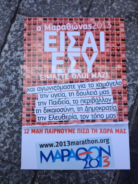 Μέλη του νέου κινήματος «Μαραθών 2013» βρίσκονται στο συλλαλητήριο στο Σύνταγμα με αφορμή τον εορτασμό της Πρωτομαγιάς.