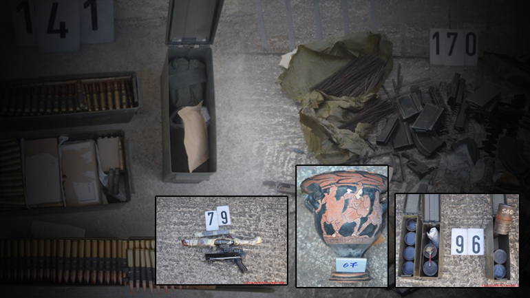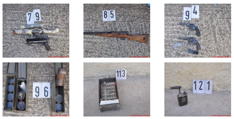 Τα ευρήματα άφησαν του αστυνομικούς εμβρόντητους καθώς βρέθηκαν και κατασχέθηκαν 12 οπλοβομβίδες, 5 πολεμικά τυφέκια, 1 υποπολυβόλο, 2 περίστροφα, 31 επιθετικές χειροβομβίδες, 32 αμυντικές χειροβομβίδες, 37 χειροβομβίδες άλλων τύπων, 62.434 φυσίγγια διαφόρων τύπων, διάφορες μεταλλικές συσκευασίες με εκρηκτική ύλη ΤΝΤ, 41 μεταλλικά κουτιά με πλήθος εξαρτημάτων και ανταλλακτικών στρατιωτικού υλικού, φωτοβολίδες κλπ.