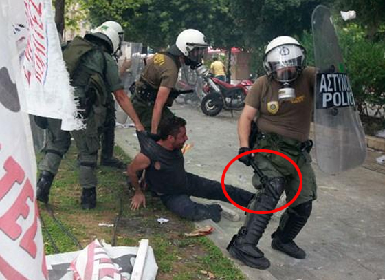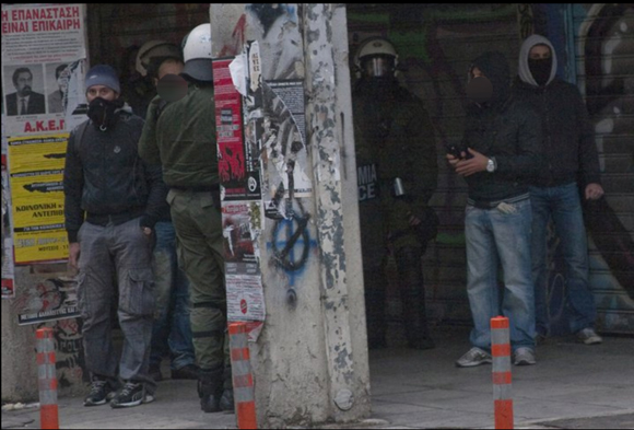 Ένα ακόμη περίεργο γεγονός προκαλεί ερωτήματα. Στην παρακάτω φωτό παρατηρούμε άνδρες των ΜΑΤ να στέκονται σε απόσταση αναπνοής από τέσσερις άνδρες που έχουν καλλυμένα τα πρόσωπά τους και φοράνε κουκούλες.