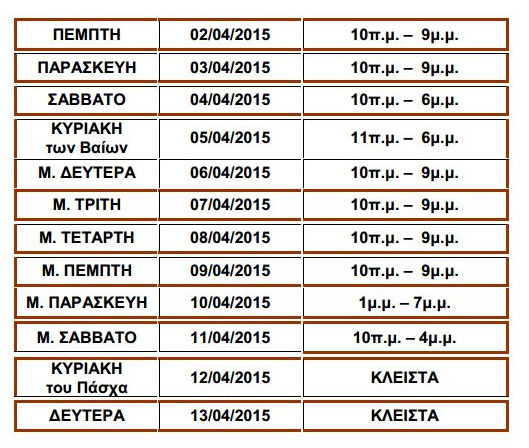 Προτεινόµενο ωράριο για την Κυριακή των Βαΐων είναι 11.00 – 18.00.