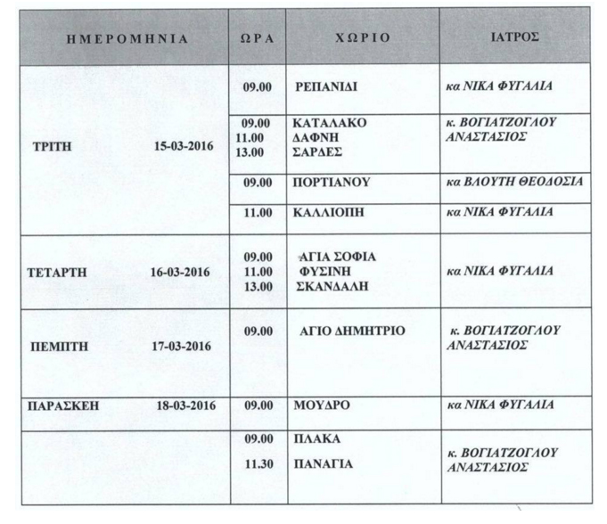 Το πρόγραμμα των επισκέψεων αγροτικών ιατρών στα χωριά της Λήμνου για την επόμενη εβδομάδα, ανακοίνωσε το νοσοκομείο του νησιού.