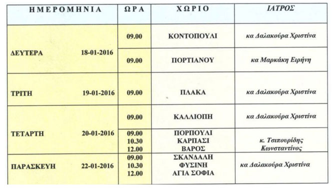 Το πρόγραμμα των επισκέψεων αγροτικών γιατρών στα χωριά της Λήμνου για την επόμενη εβδομάδα, ανακοίνωσε το Νοσοκομείο του ακριτικού νησιού.