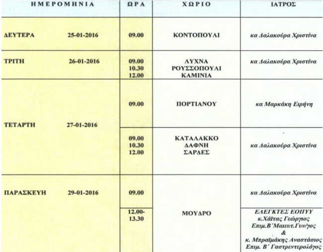 Το πρόγραμμα των επισκέψεων αγροτικών γιατρών στα χωριά της Λήμνου για την επόμενη εβδομάδα, ανακοίνωσε το Νοσοκομείο του νησιού.