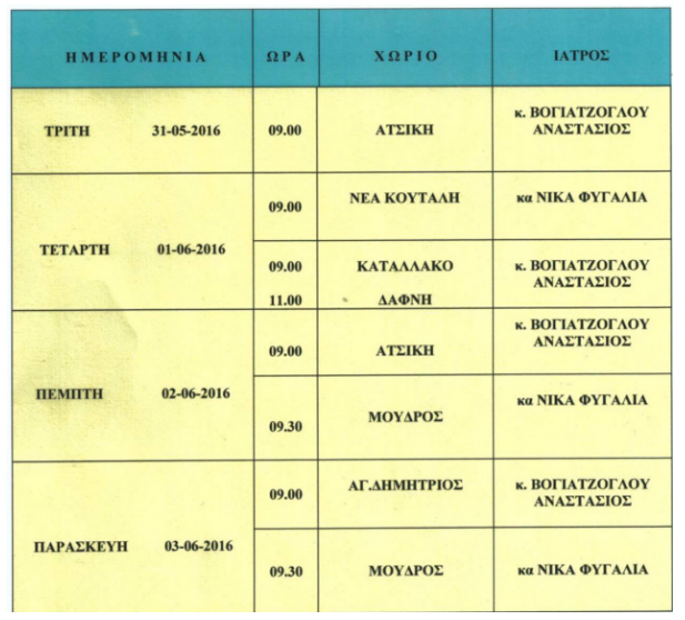 Το πρόγραμμα επισκέψεων των αγροτικών γιατρών στα χωριά της Λήμνου για την επόμενη εβδομάδα, ανακοίνωσε το Νοσοκομείο του νησιού.