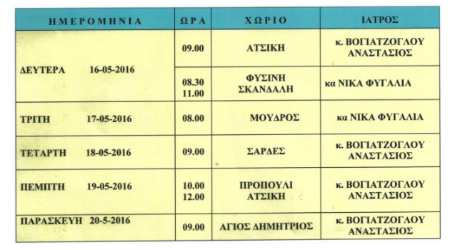 Το πρόγραμμα των επισκέψεων αγροτικών γιατρών στα χωριά της Λήμνου για την επόμενη εβδομάδα, ανακοίνωσε το Νοσοκομείο του νησιού. Ειδικότερα, από 16 έως 20 Μαΐου, το πρόγραμμα διαμορφώνεται ως εξής: