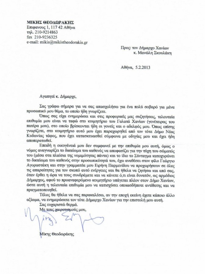 Με την επιστολή – η οποία μέχρι τώρα είχε πρωτοκολληθεί ως εμπιστευτική – ο Μίκης Θεοδωράκης ενημέρωνε τον Μανώλη Σκουλάκη για την επιθυμία του να ταφεί στο νεκροταφείο του Γαλατά και για τις ενέργειες που έχουν γίνει προκειμένου να αποκτηθεί ο τάφος.