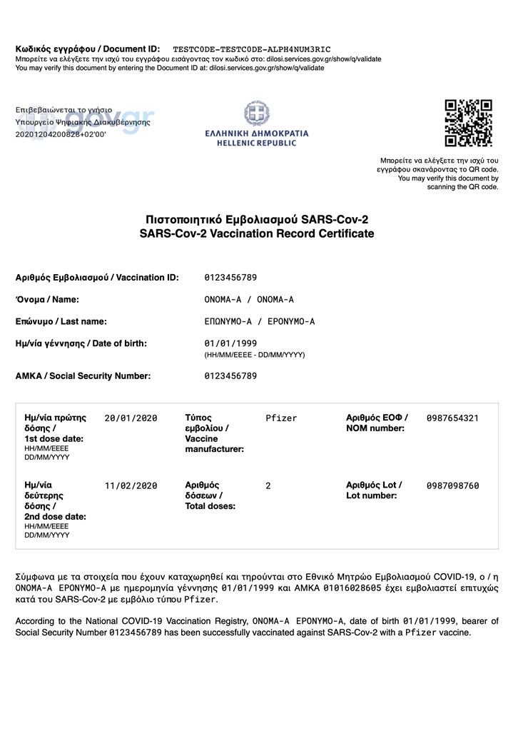 Η φόρμα, εκτός από τα στοιχεία των πολιτών, αναφέρει την εταιρεία που παρασκεύασε το εμβόλιο, καθώς και τις ημερομηνίες χορήγησης της πρώτης και της δεύτερης δόσης. Το πιστοποιητικό περιλαμβάνει και QR code.