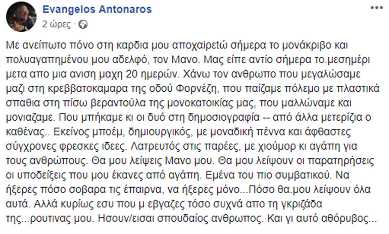 «Με ανείπωτο πόνο στη κάρδια μου αποχαιρετώ σήμερα το μονάκριβο και πολυαγαπημένου μου αδελφό, τον Μάνο. Μας είπε αντίο σήμερα το μεσημέρι μετά από μια άνιση μάχη 20 ημερών. Χάνω τον άνθρωπο που μεγαλώσαμε μαζί στη κρεβατοκάμαρα της οδού Φορνέζη, που παίζαμε πόλεμο με πλαστικά σπαθιά στη πίσω βεραντούλα της μονοκατοικίας μας, που μαλώναμε και μονιάζαμε. Που μπήκαμε κι οι δυο στη δημοσιογραφία -από άλλα μετερίζια. Εκείνος μποέμ δημιουργικός με μοναδική πέννα και άφθαστες σύγχρονες φρέσκες ιδέες. Λατρευτός στις παρέες, με χιούμορ κι αγάπη για τους ανθρώπους. Θα μου λείψεις Μάνο μου. Θα μου λείψουν οι παρατηρήσεις, οι υποδείξεις που μου έκανες από αγάπη. Εμένα του πιο συμβατικού. Να ήξερες πόσο σοβαρά τις έπαιρνα, να ήξερες μόνο… Πόσο θα μου λείψουν όλα αυτά. Αλλά κυρίως εσύ που μ έβγαζες τόσο συχνά από τη γκριζάδα της…ρουτίνας μου. Ήσουν/είσαι σπουδαίος άνθρωπος. Και γι αυτό αθόρυβος».