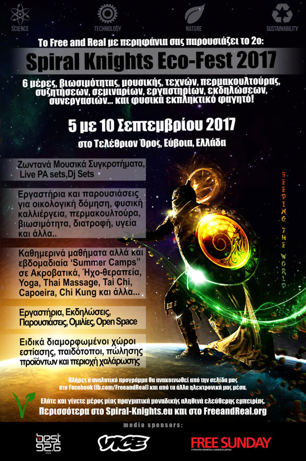 Από τις 5 έως τις 10 Σεπτέμβρη Το Free and Real, η ομαδα που δημιούργησε και λειτουργεί τα τελευταία 7 χρόνια το πρώτο σχολείο αυτάρκειας και βιωσιμότητας στη χώρα μας, διοργανώνουν για δεύτερη συνεχόμενη χρόνια το Spiral Κnights Eco-Festival! Οι περισσότεροι από 2500 επισκέπτες, οι 250 σκηνές που στήθηκαν πέρυσι, οι 50 και πλέον συντονιστές, δάσκαλοι και ομιλητές αλλά και το συνεχές ενδιαφέρον όσων έχουν επισκεφτεί το εγχείρημα (πάνω από 25.000 άτομα) έδωσε τη δύναμη και την έμπνευση η διοργάνωση να μεγαλώσει!