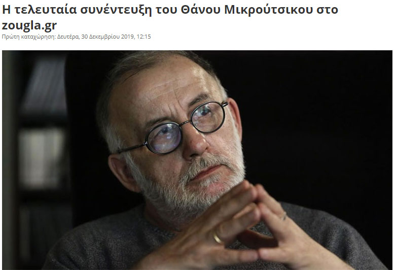 Το απομεσήμερο της Δευτέρας 30 του Δεκέμβρη του 2019, προτελευταία ημέρα του χρόνου, συγκεντρώθηκαν οι φίλοι και οι συγγενείς, σύντροφοι και μη, πολίτες απλοί και καλλιτέχνες γνωστοί, για να αποχαιρετήσουν τον Θάνο Μικρούτσικο. «Έφυγε» νωρίς, αφού πάλεψε γερά με το «θεριό», όπως αποκαλούσε τον καρκίνο. Προσπάθησε να κερδίσει κάμποσους γύρους πριν πέσει από το τελευταίο χτύπημα. Μέχρι τότε άντεχε.