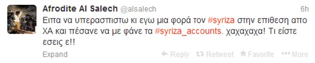 Ένα retweet της Αφροδίτης Αλ Σαλέχ στον Ηλία Παναγιώταρο ήταν αρκετό για να προκαλέσει σάλο στο Twitter με πολλούς χρήστες να την κατηγορούν ότι προωθεί τις θέσεις της Χρυσής Αυγής.