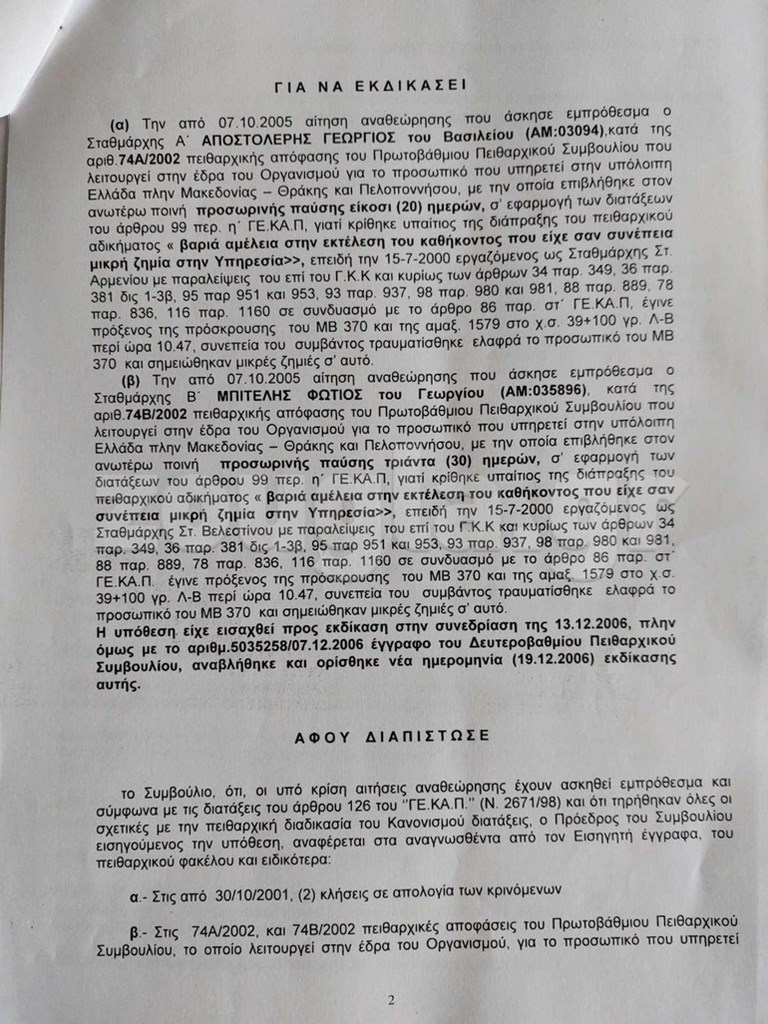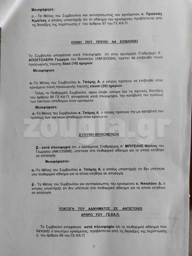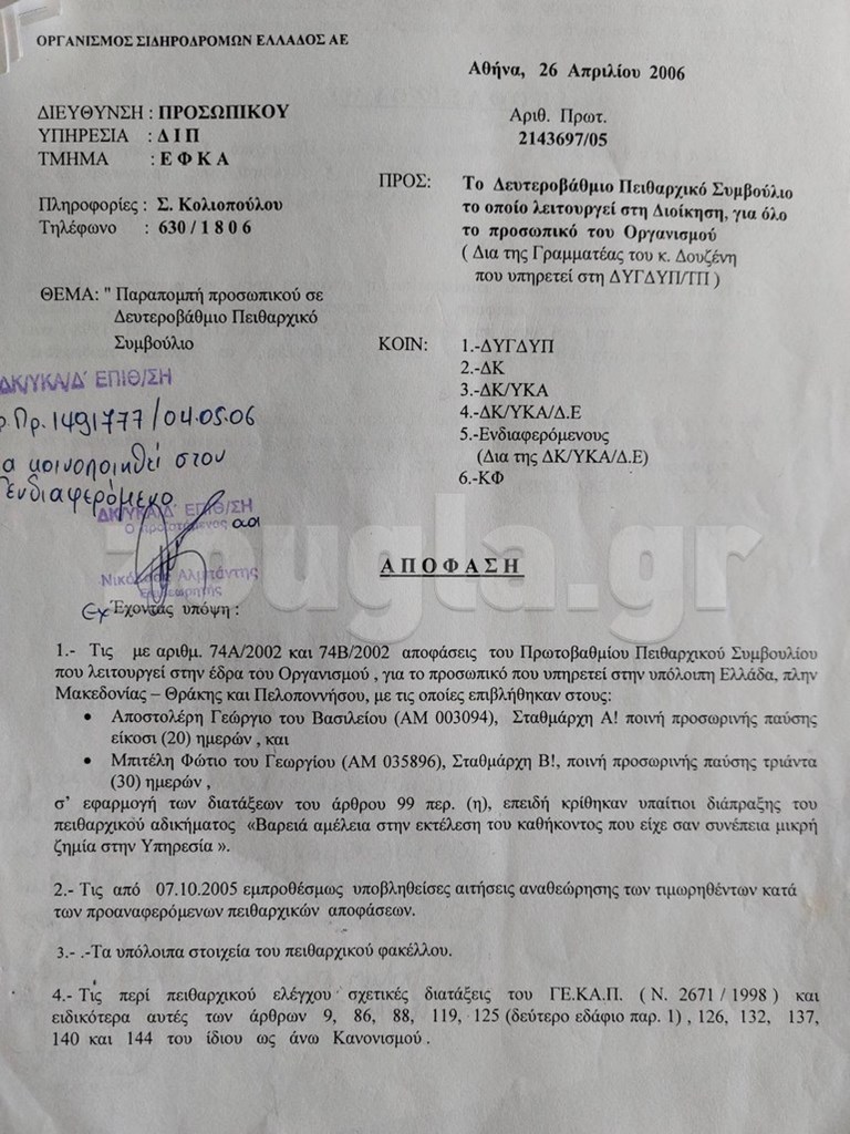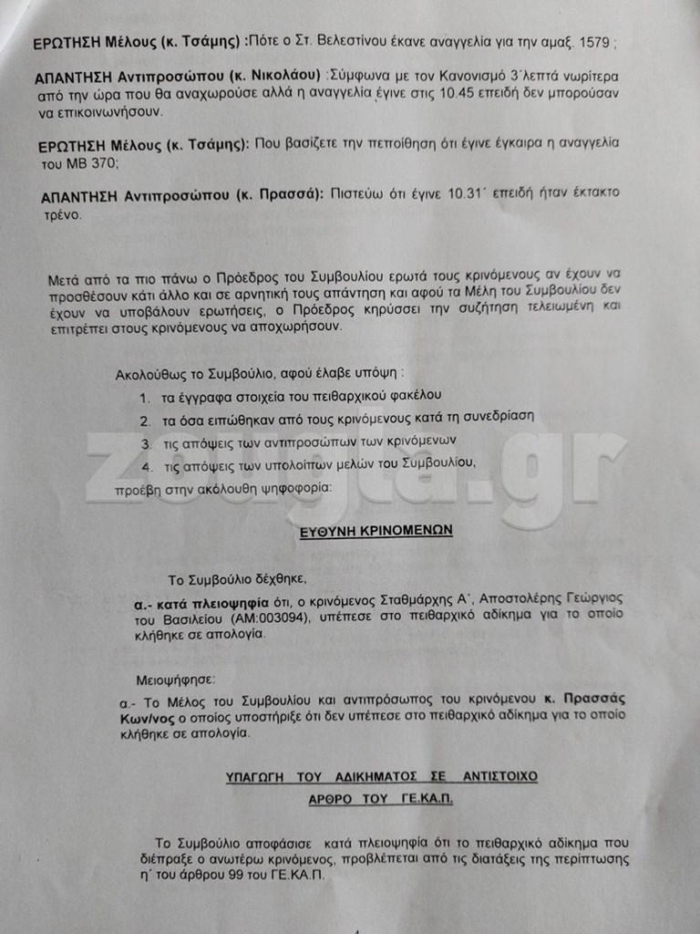 Στους δύο σταθμάρχες θα επιβληθεί από το Δευτεροβάθμιο Πειθαρχικό Συμβούλιο η ποινή της παύσης από τα καθήκοντά τους δέκα ημερών.