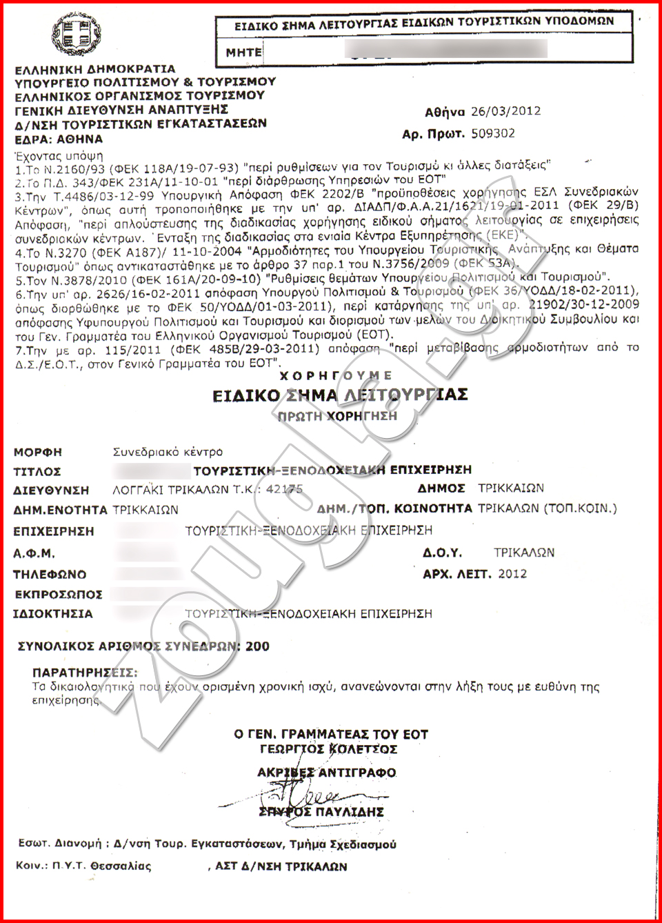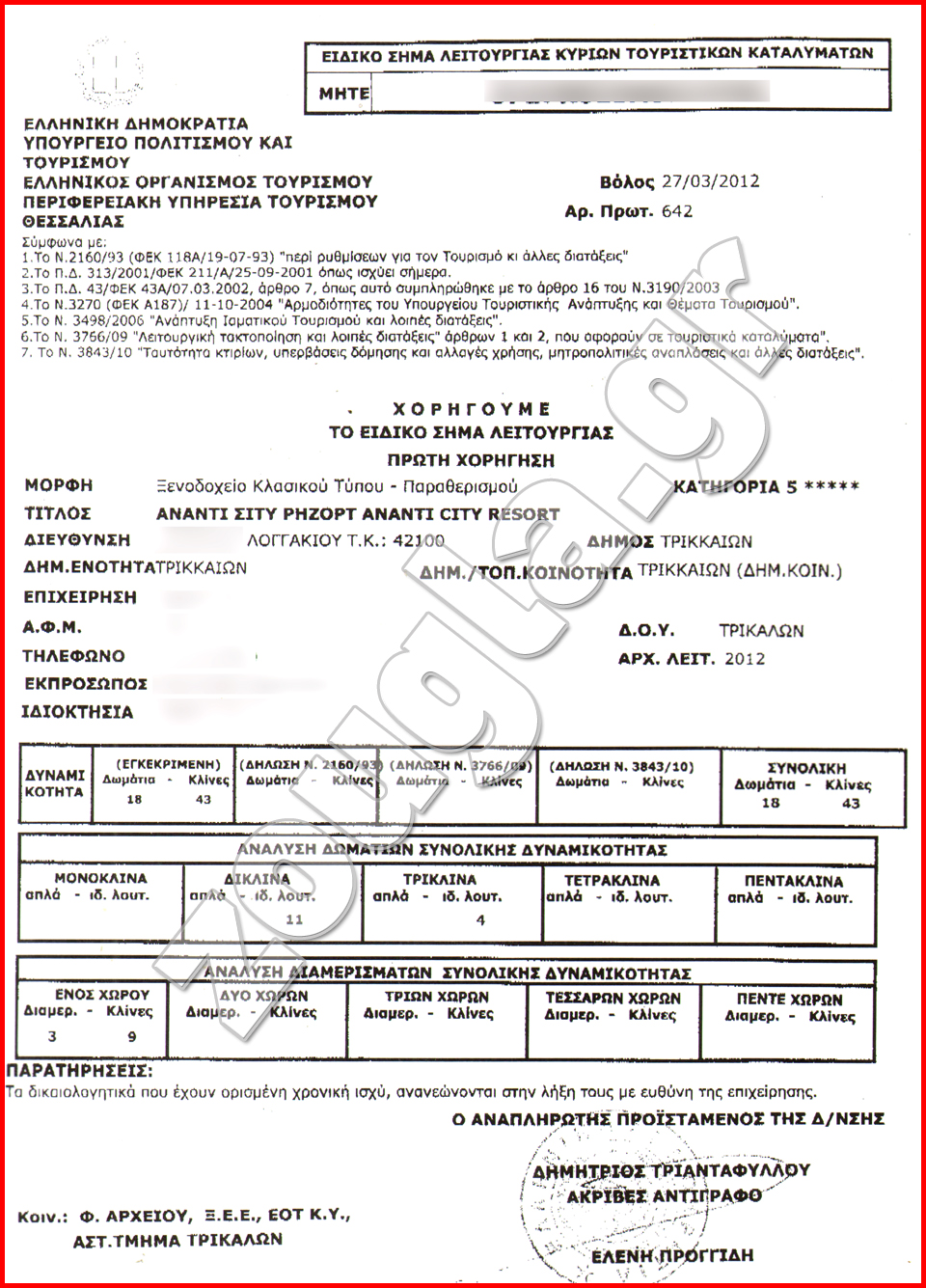 Επιπλέον, πλήθος ερωτημάτων εγείρει το γεγονός ότι παρ’ όλο που η Πολεοδομία έχει διαπιστώσει σωρεία παρανομιών και αυθαιρεσιών, η Περιφερειακή Υπηρεσία Τουρισμού Θεσσαλίας, η οποία υπάγεται στον Ελληνικό Οργανισμό Τουρισμού, χορήγησε στην εταιρία, στις 26 και 27 Μαρτίου 2012, ειδικό σήμα λειτουργίας.