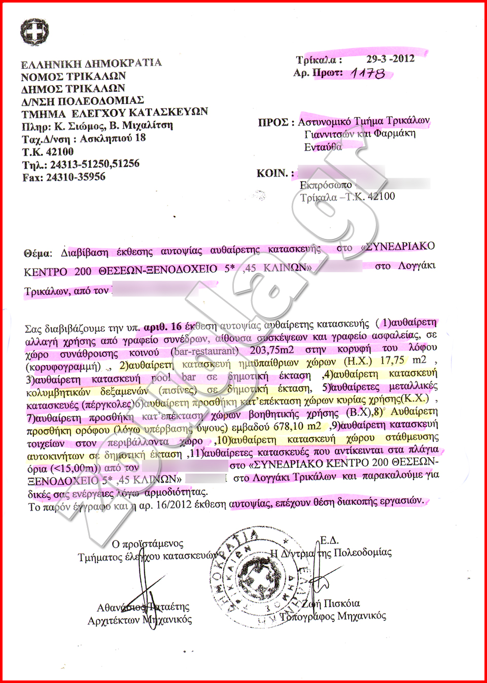 «Λόγω των πολεοδομικών παραβάσεων η Υπηρεσία μας δεν θεώρησε την οικοδομική άδεια και δεν ενέκρινε την σύνδεση του Συνεδριακού Κέντρου-Ξενοδοχείου με τα δίκτυα κοινής ωφελείας. Επίσης δεν χορήγησε σχετικές βεβαιώσεις νομιμότητας της κατασκευής ή επί μέρους χώρων αυτής για να χρησιμοποιηθούν για χορήγηση άδειας λειτουργίας ή για οποιαδήποτε άλλη χρήση» αναφέρεται χαρακτηριστικά στο επίσημο έγγραφο της πολεοδομίας.