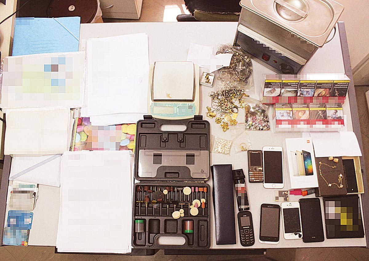Κοσμήματα και ρολόγια, 2 βάσεις ελέγχου κοσμημάτων, 1 συσκευή καθαρισμού μεταλλικών αντικειμένων, 2 πεντόλιρα, 1 πλαστό χαρτονόμισμα των 500 ευρώ, 57 κομμάτια μαύρου χαρτιού με εντυπώματα του χαρτονομίσματος των 500 ευρώ, το χρηματικό ποσό των 1.000 ευρώ, χρηματικά ποσά ξένων χωρών, πλήθος ιδιόχειρων σημειώσεων, τραπεζικές επιταγές, 3 ηλεκτρονικοί υπολογιστές, 2 ηλεκτρονικές συσκευές αποθήκευσης δεδομένων, πλήθος κινητών τηλεφώνων, 1 πιστόλι, 1 ξίφος, 1 μαχαίρι, 1 σπρέι πιπεριού, 28 φυσίγγια των 9 mm, 5 φυσίγγια κρότου, 1 νάιλον συσκευασία με μικροποσότητα ακατέργαστης κάνναβης, 1 ναρκωτικό δισκίο, 2 ηλεκτρονικές ζυγαριές ακριβείας, 18 πακέτα τσιγάρων, για τα οποία δεν έχουν καταβληθεί στο δημόσιο οι ανάλογοι φόροι και δασμοί.