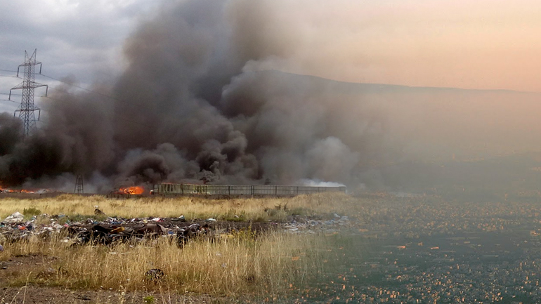 Αν και η φωτιά είναι υπό έλεγχο, συνεχίζει να καίει χαρτί και πλαστικό, με αποτέλεσμα η ατμόσφαιρα πολλών περιοχών της Αθήνας να έχει επιβαρυνθεί.