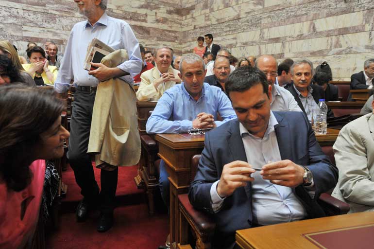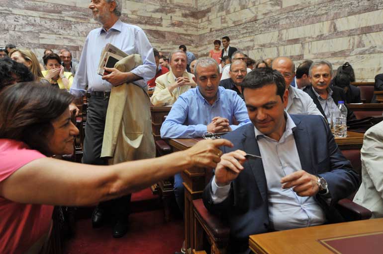 Η αναπληρώτρια υπουργός Κοινωνικής Αλληλεγγύης Θεανώ Φωτίου δίνει την Κάρτα Αλληλεγγύης στον Αλέξη Τσίπρα κατά τη διάρκεια της συνεδρίασης της Κοινοβουλευτικής Ομάδα του ΣΥΡΙΖΑ το μεσημέρι στη Βουλή