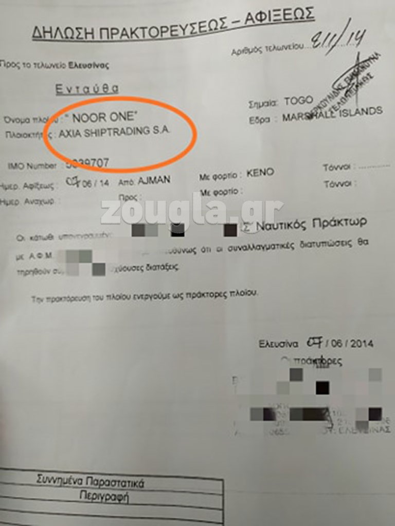 Το ένα έγγραφο (ΔΗΛΩΣΗ ΠΡΑΚΤΟΡΕΥΣΕΩΣ-ΑΦΞΙΞΕΩΣ) δείχνει πως στο τελευταίο ταξίδι του “Noor 1” στην Ελευσίνα, οι συναλλαγματικές διατυπώσεις που έγιναν από ναυτικό πράκτορα στις 7-6-2014, εμφανίζεται ως πλοιοκτήτης η εταιρεία AXIA SHIPTRADING SA των Φάρου-Τζανετή.