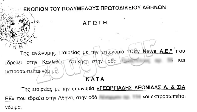 – Για τις εκπομπές που προβλήθηκαν τον Σεπτέμβριο του 2012, στην αγωγή αναφέρεται ότι η «Γεωργιάδης Λεωνίδας Α. και ΣΙΑ ΕΕ» οφείλει στη «City News Α.Ε.» 15.990 ευρώ.